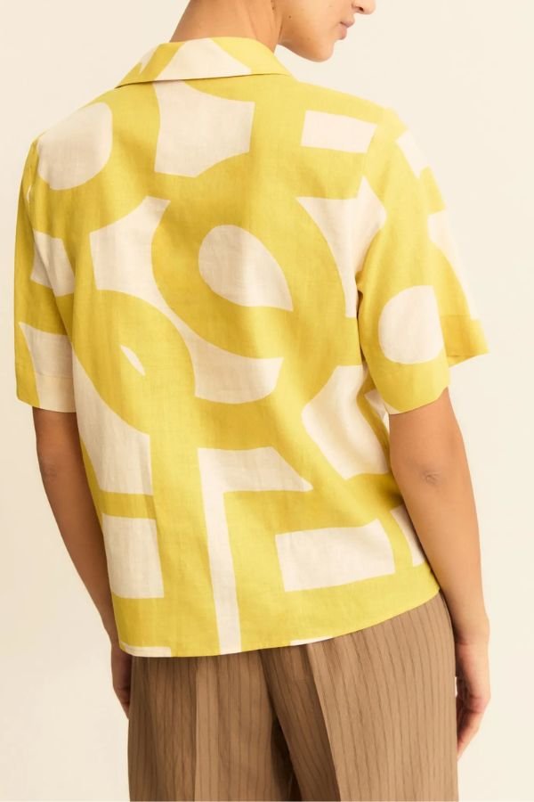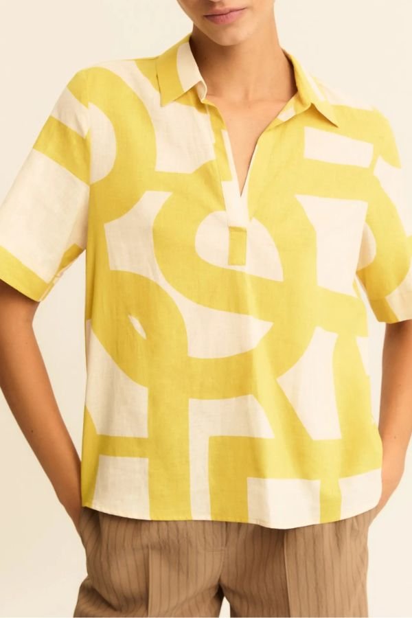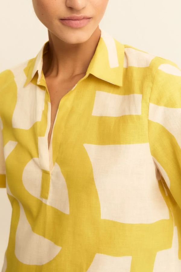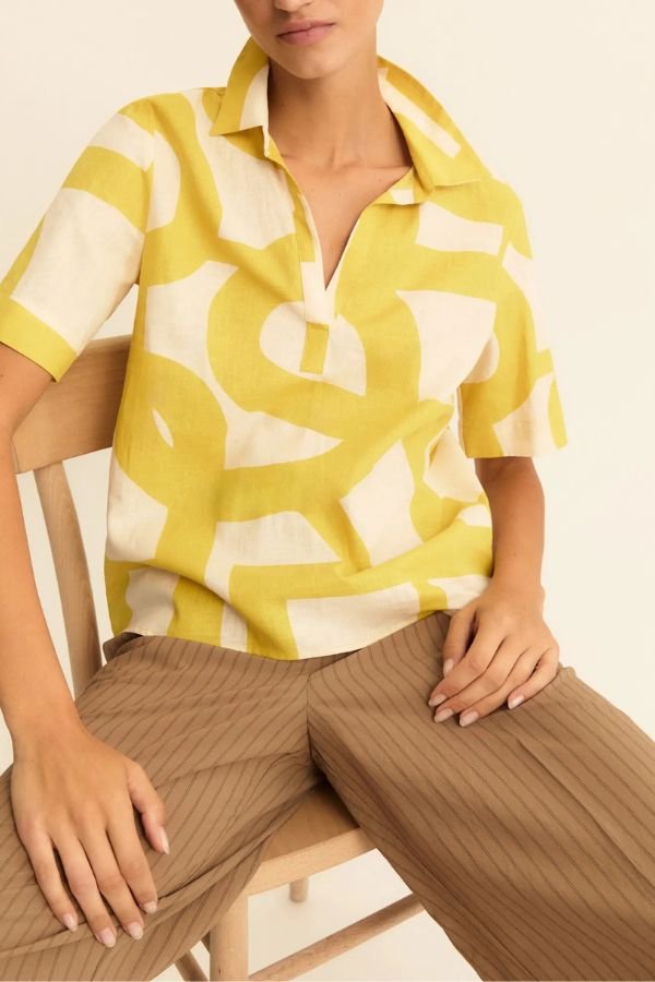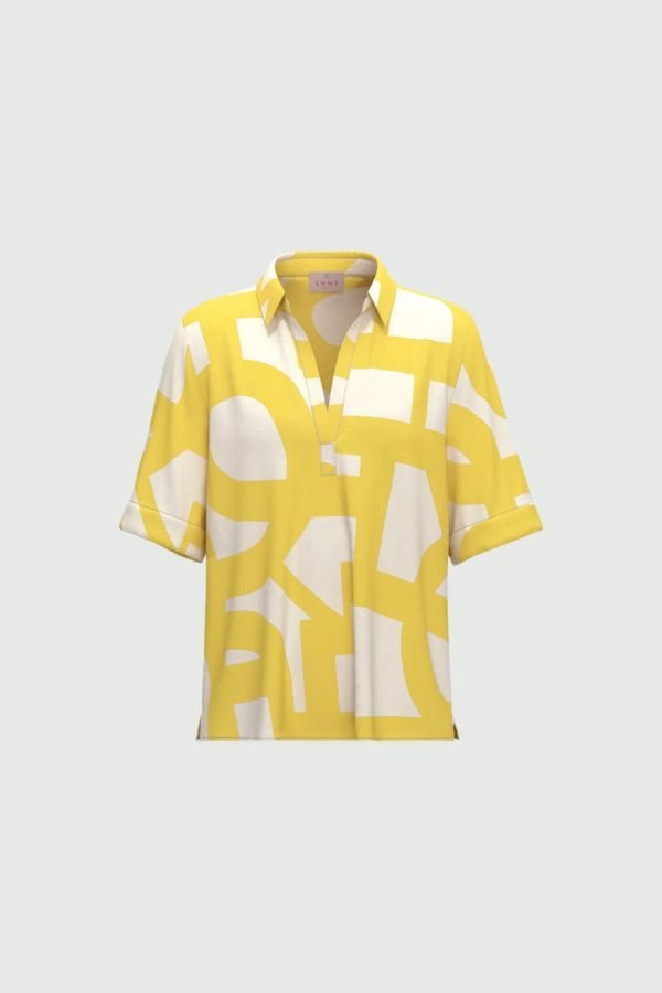 Κοντομάνικη, εμπριμέ μπλούζα, από ελαφρύ λινό και βαμβάκι, από την εταιρεία Emme. Κλασικός γιακάς πουκαμίσου χωρίς κουμπιά και άνετη, χαλαρή εφαρμογή.