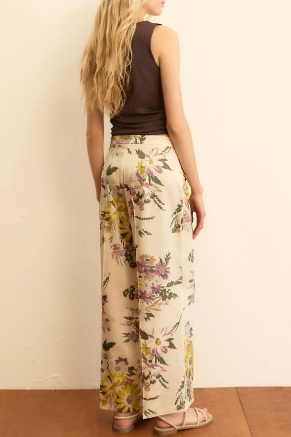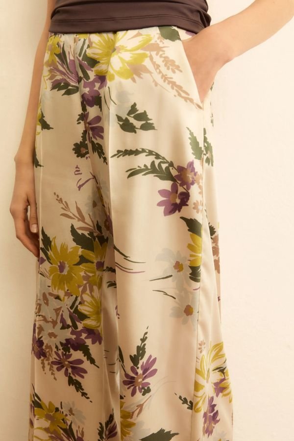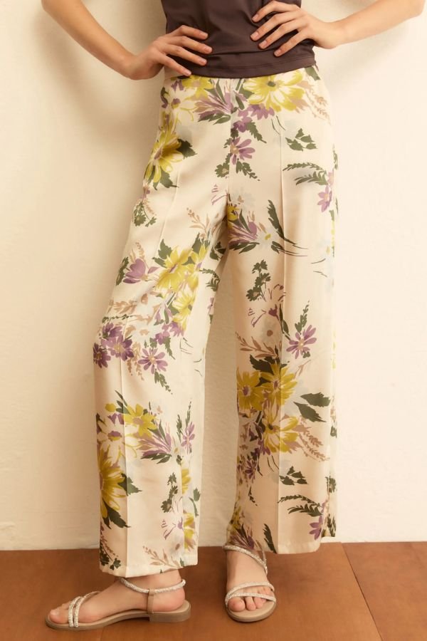 Floral, twill παντελόνι, με all-over print και ελαφρύ ύφασμα, από την εταιρεία Emme. Κλείσιμο με φερμουάρ στο πλάι και λοξές τσέπες στα πλάγια. Πιέτες μπροστά και πίσω και κλασική γραμμή.