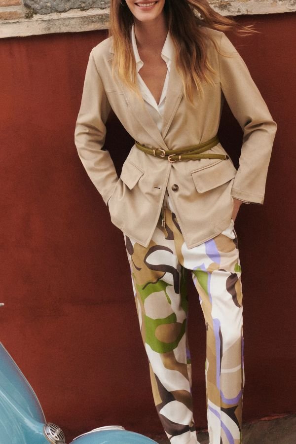 Άνετο, βισκόζ παντελόνι σε στυλ jogger με all-over print, από την εταιρεία Emme. Ελαστική μέση με κορδόνι. Πιέτες μπροστά και πίσω και πλαϊνές τσέπες. Regular fit.