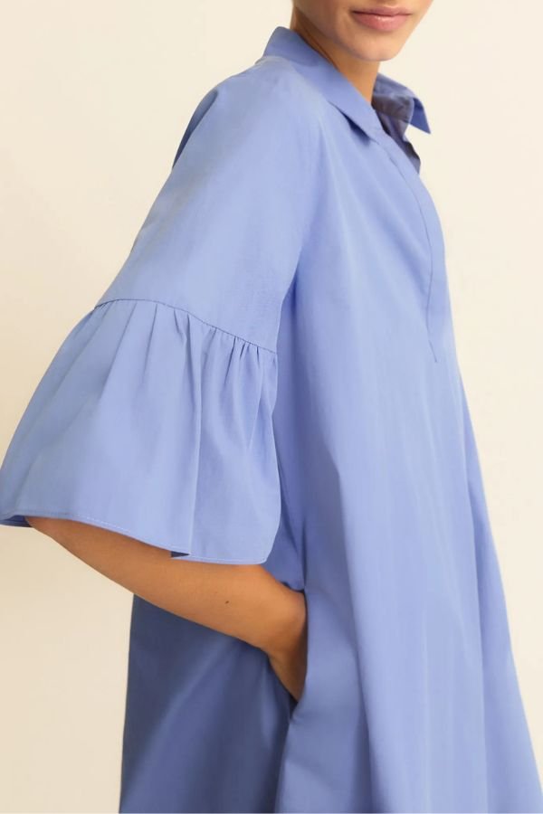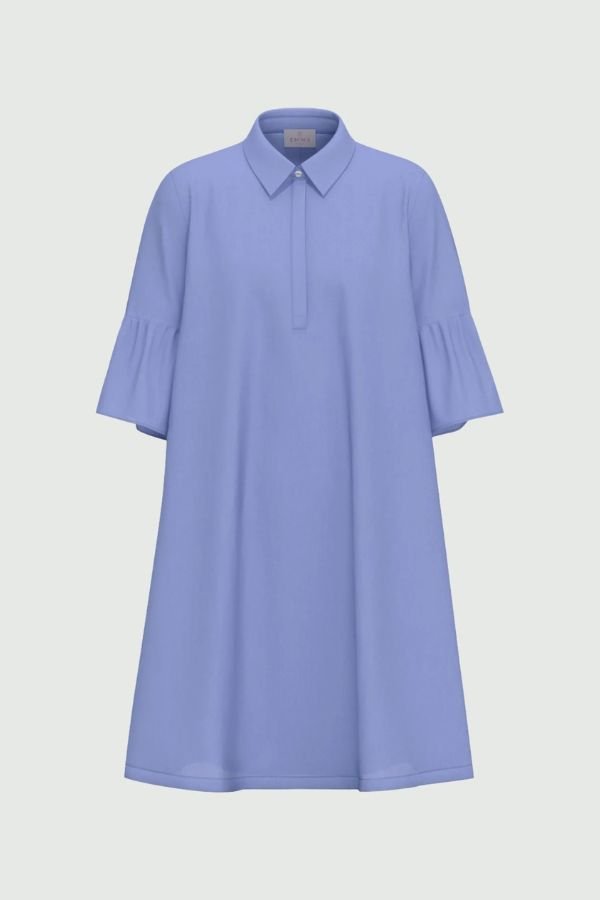 Midi φόρεμα, απο βαμβακερή ποπλίνα, από την εταιρεία Emme. Μανίκια 3/4 με βολάν και πλαϊνές τσέπες στη ραφή. Polo γιακάς με κρυφή πατιλέτα με κουμπιά. Χαλαρή γραμμή.