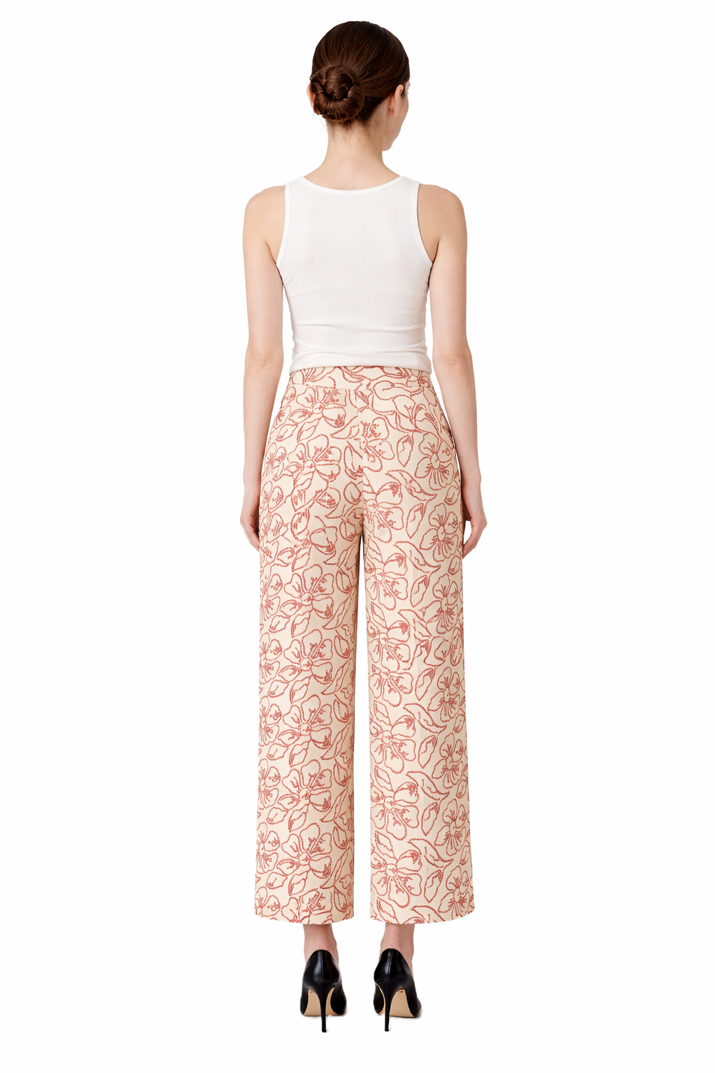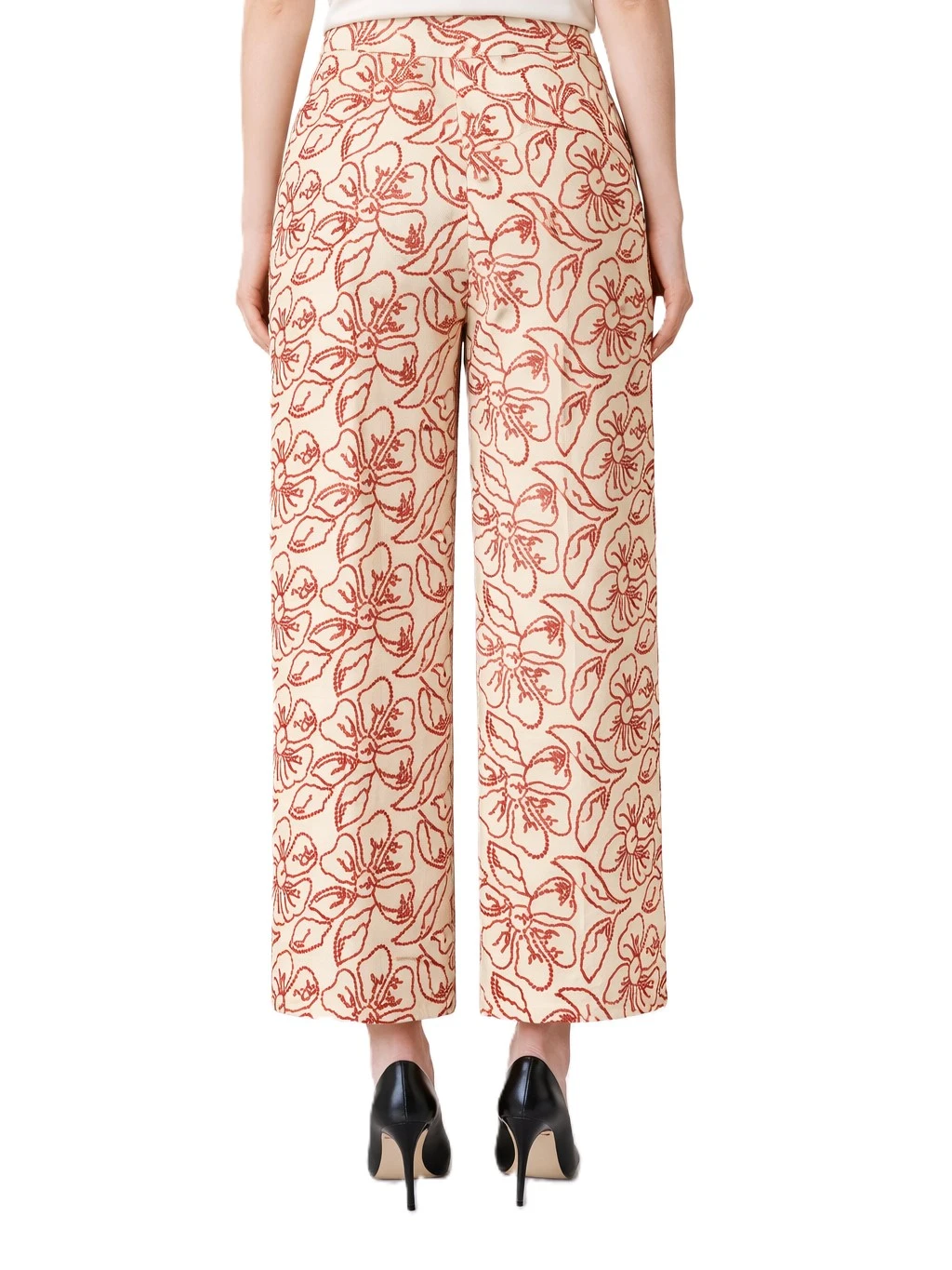 Ψηλόμεσο παντελόνι, με κεντημένο, all-over floral μοτίβο, από την εταιρεία Emme. Κλείσιμο με φερμουάρ και κουμπί και πλαϊνές τσέπες. Ίσια γραμμή και μήκος μέχρι τον αστράγαλο.