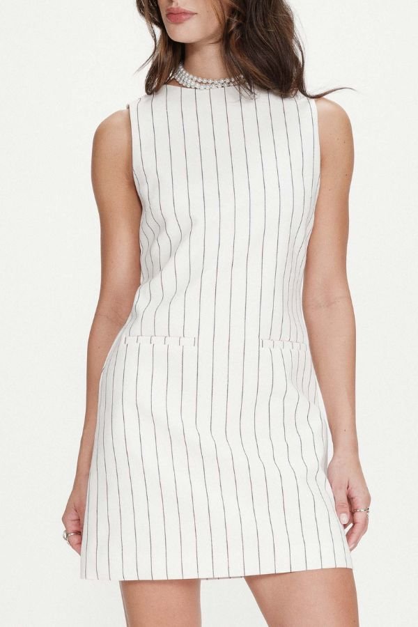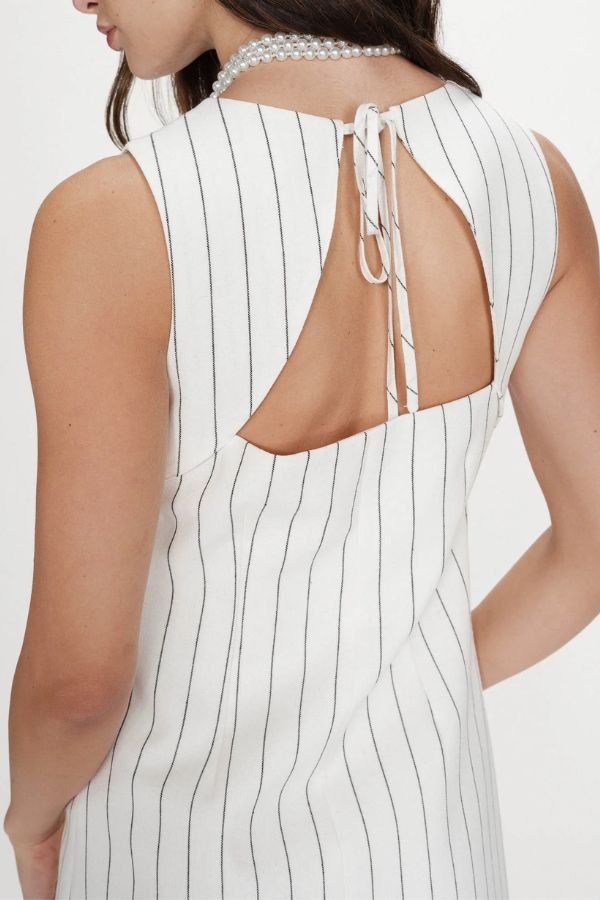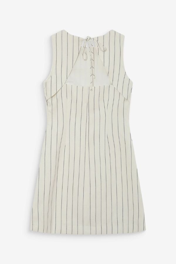 Mini, ριγέ φόρεμα, από λινό, από την εταιρεία Grace & Mila. Στρογγυλή λαιμόκοψη και άνοιγμα με δέσιμο στην πλάτη. Ελαφρώς εφαρμοστή εφαρμογή με φερμουάρ στο πλάι και τσέπες μπροστά. Πλήρως φοδραρισμένο.