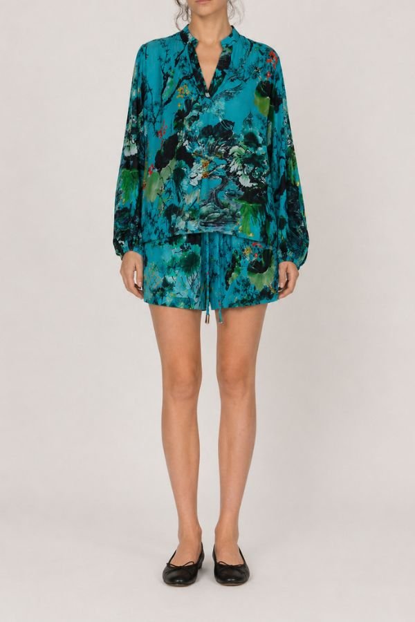 Ανάλαφρη, μεταξωτή μπλούζα, με all-over floral print με κεντημένες λεπτές χάντρες στο πάνω μέρος, από την εταιρία INOA. Mao γιακάς με V λαιμόκοψη και μακριά μανίκια με λάστιχο στο τελείωμα.
