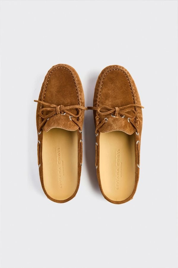 Slip-on, καστόρινα mules, με κορδόνια και μεταλλικές λεπτομέρειες, από τη σχεδιάστρια Liviana Conti.