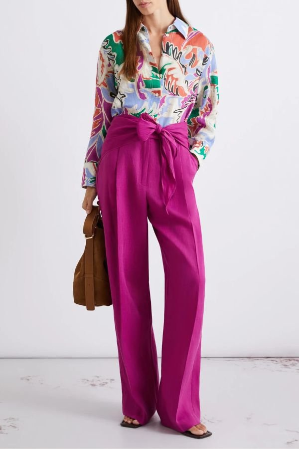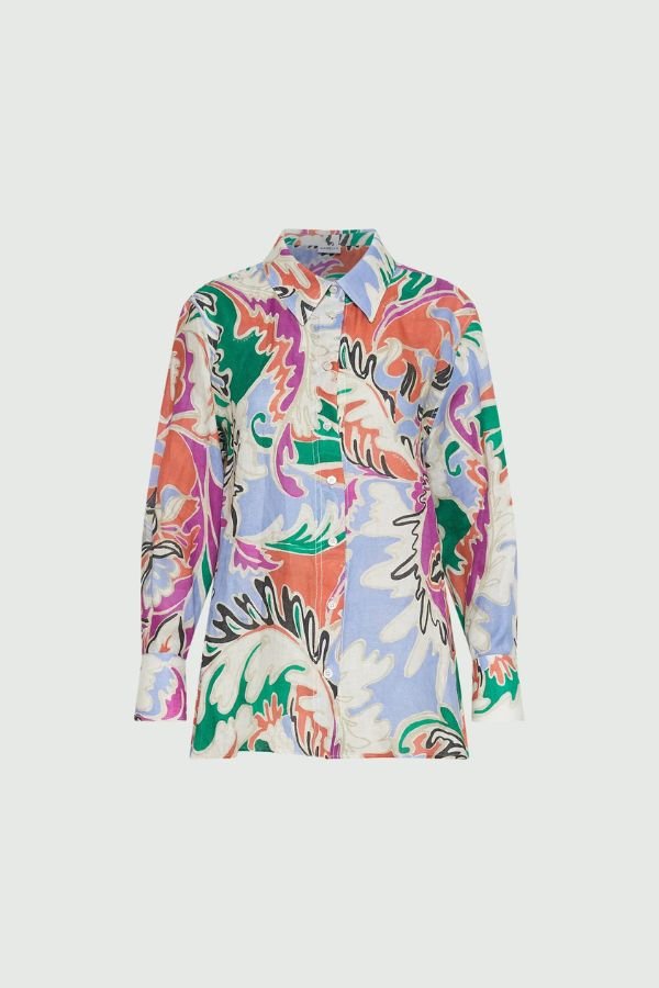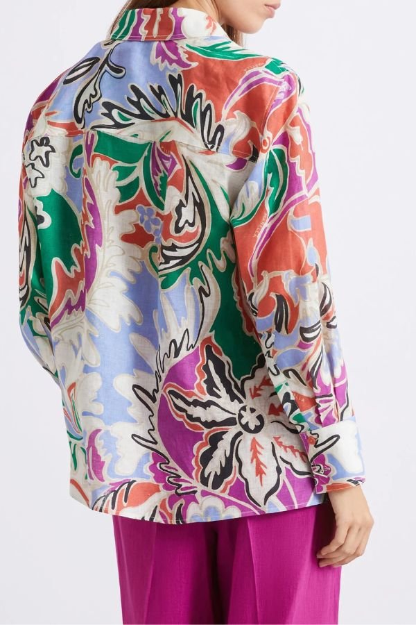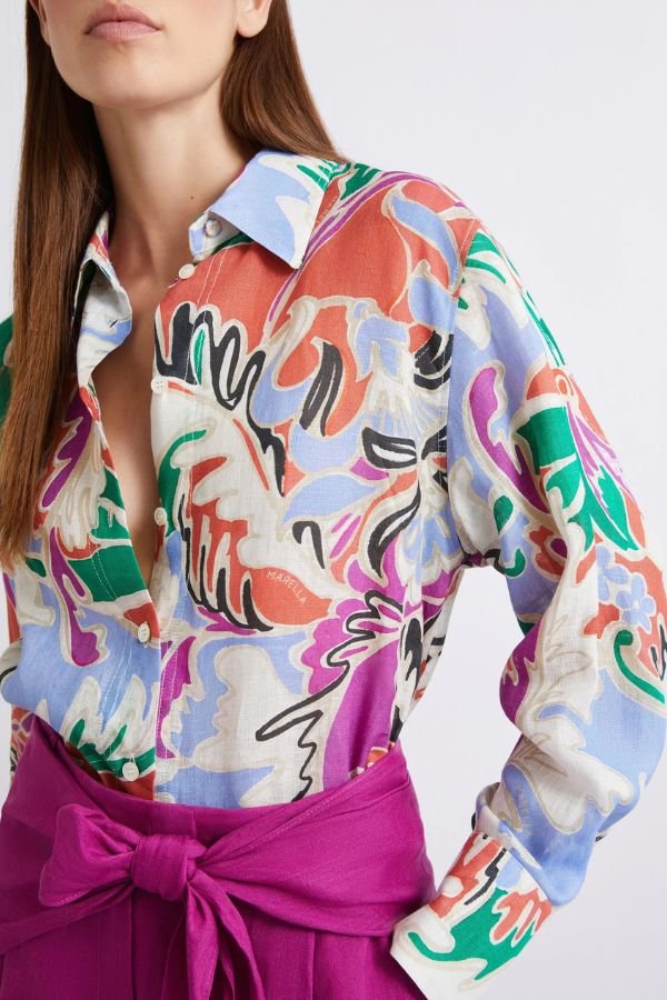 Φαρδύ, λινό πουκάμισο, με εμπριμέ print, από την εταιρεία Marella. Μακριά μανίκια με κουμπιά στις μανσέτες, κλασικό γιακά πουκαμίσου και σκίσιμο στα πλαϊνά.