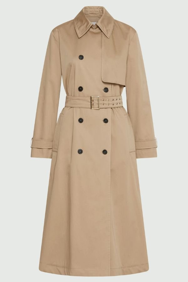 Καπαρντίνα, από ελαστικό βαμβακερό σατέν με αδιάβροχο φινίρισμα, από την εταιρεία Marella. Διαχρονική αισθητική και θηλυκή γραμμή με κανονική εφαρμογή. Σταυρωτό κλείσιμο με εμφανή κουμπιά και ζώνη με μεταλλικά τρουκς και χρυσή αγκράφα. Γιακάς πουκαμίσου και yoke στον αριστερό ώμο και στην πλάτη.