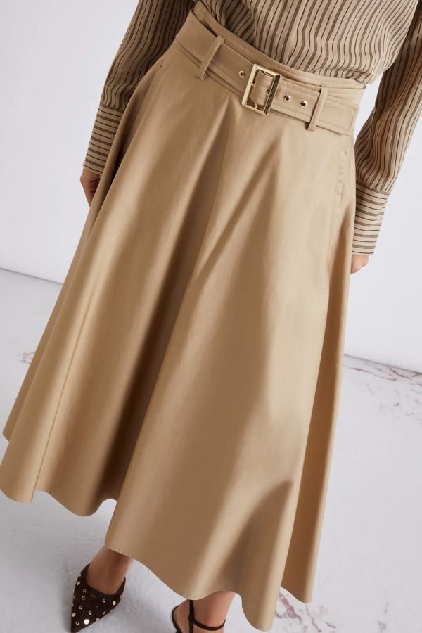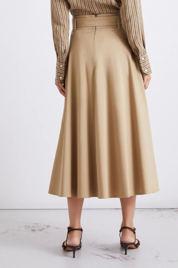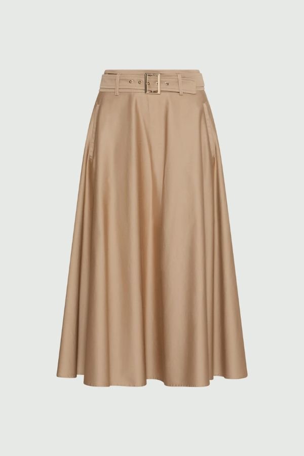 Midi φούστα, από ελαστικό βαμβακερό σατέν με αδιάβροχο φινίρισμα, από τη Marella. Casual chic αισθητική, κυκλική γραμμή και κανονική εφαρμογή. Ζώνη από το ίδιο ύφασμα με μεταλλική αγκράφα που τονίζει τη μέση και πλαϊνές τσέπες. Κλείσιμο στο πίσω μέρος με φερμουάρ και μεταλλικό κούμπωμα.