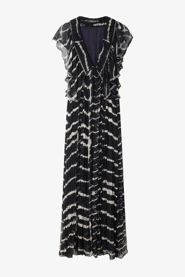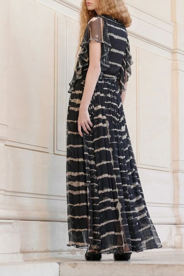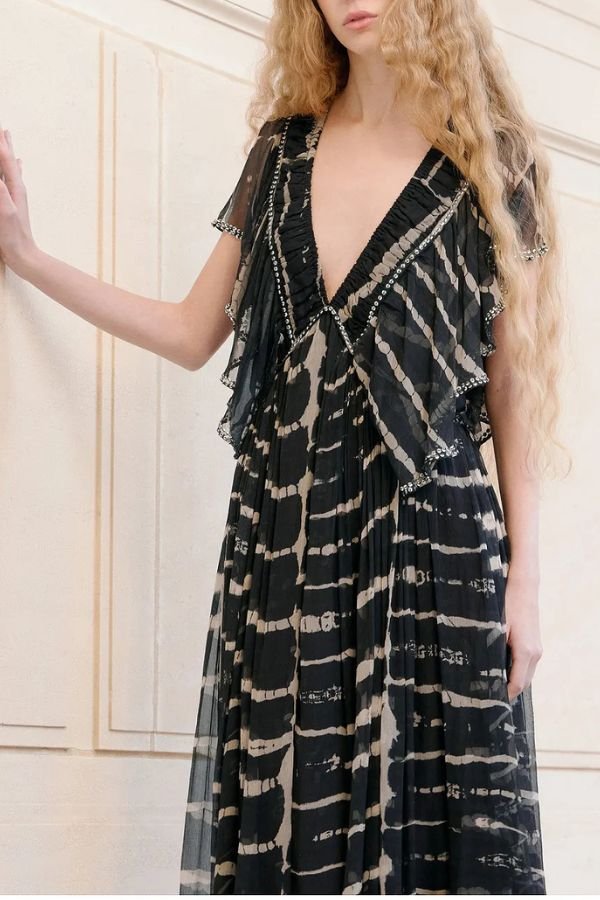Τie-dye, μακρύ chiffon φόρεμα από viscose, από την εταιρία Mes Demoiselles Paris. Βαθιά v-λαιμόκοψη και κοντά μανίκια από διαφανή βολάν. Closs τελείωμα και κανονική εφαρμογή.