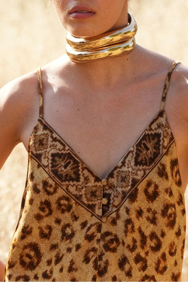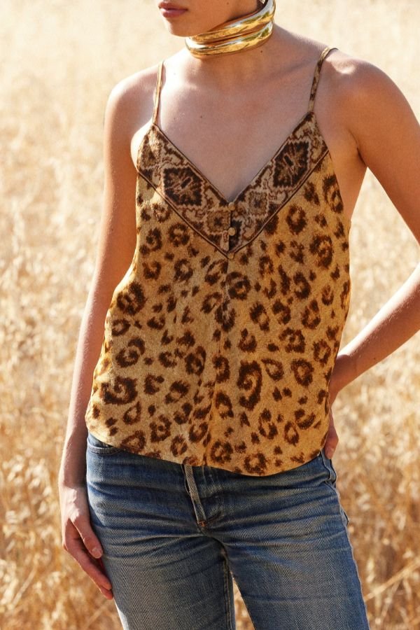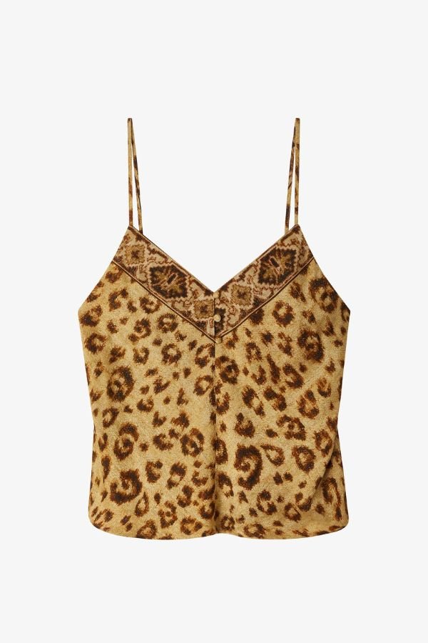 Animal print top από jacquard βισκόζ, σε ίσια γραμμή, από την εταιρία Mes Demoiselles Paris. V σχέδιο στο ντεκολτέ με διακοσμητικά κουμπιά. Λεπτές ρυθμιζόμενες τιράντες.