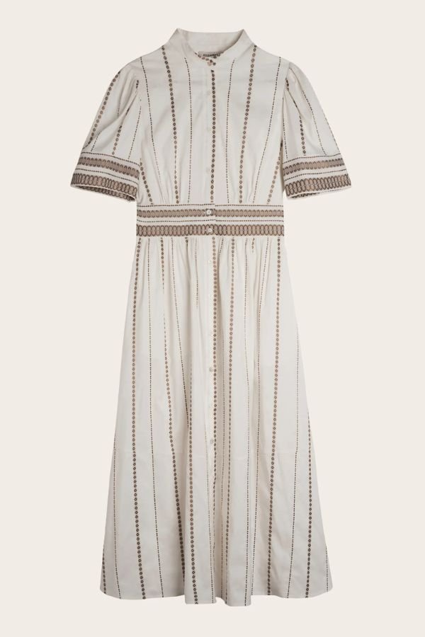 Midi shirt-dress, από ζακάρ βαμβάκι και μετάξι, από την εταιρία Zeus + Dione. Mao γιακάς και πατιλέτα μπροστά. Εφαρμοστό μπούστο με φαρδιά, κοντά μανίκια. Στενή μέση που καταλήγει σε φαρδιά φούστα.