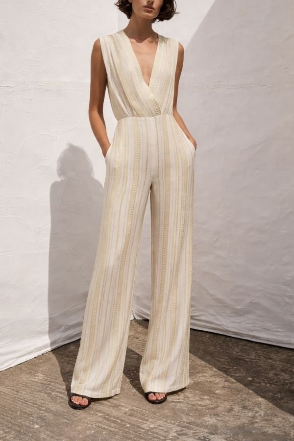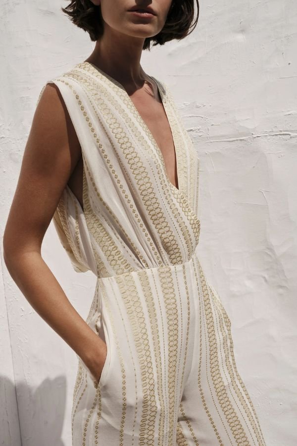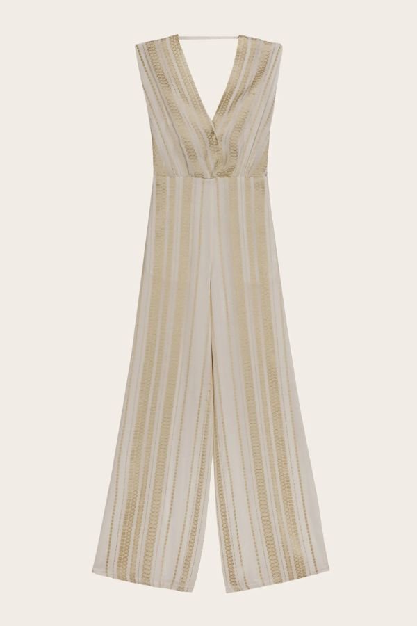 Αμάνικη, ολόσωμη φόρμα, από μεταξωτό jacquard, σε ιβουάρ απόχρωση, με χρυσές μεταλλικές λεπτομέρειες, από την εταιρία Zeus + Dione. Βαθύ κρουαζέ ντεκολτέ σε σχήμα V και ανοιχτή πλάτη, με δέσιμο στο λαιμό και draped effect. Εφαρμοστή μέση, τσέπες στο πλάι και φαρδιά μπατζάκια.