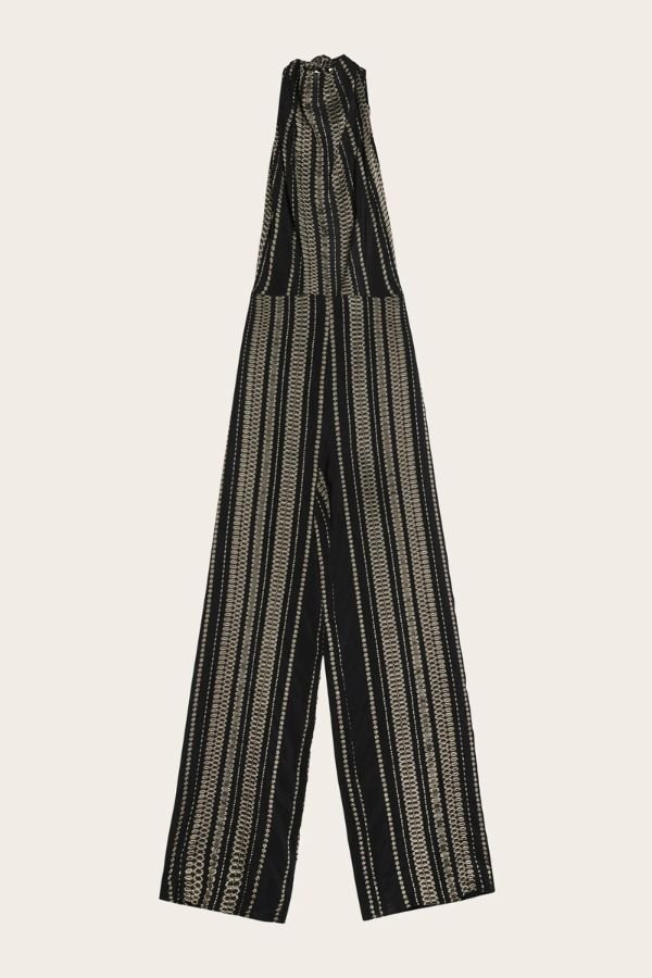 Ολόσωμη φόρμα, από μαύρο μεταξωτό jacquard, με χρυσές μεταλλικές λεπτομέρειες, από την εταιρία Zeus + Dione. Halter λαιμόκοψη με draped effect, εφαρμοστή μέση που αναδεικνύει τη σιλουέτα και φαρδιά μπατζάκια σε relaxed γραμμή.