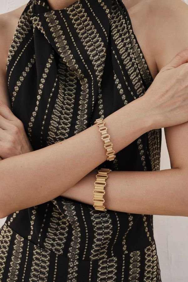 Ολόσωμη φόρμα, από μαύρο μεταξωτό jacquard, με χρυσές μεταλλικές λεπτομέρειες, από την εταιρία Zeus + Dione.